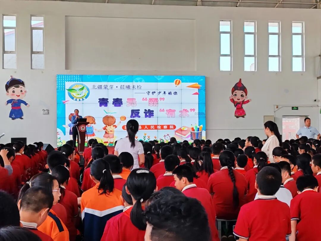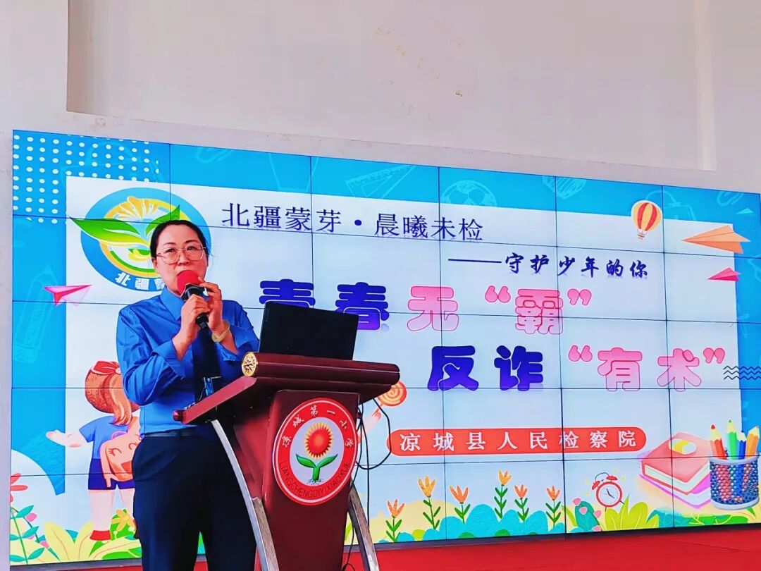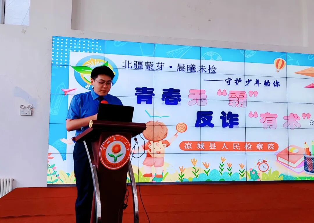 秋意渐浓,书声朗朗。新学期伊始,为筑牢校园安全防线,守护少年儿童健康成长,近日,凉城县检察院充分发挥法治副校长职能作用,积极开展送法进校园活动,法治副校长带领“北疆蒙芽·晨曦未检”团队走进凉城县第一小学,为同学们带来了一堂别开生面的“开学法治第一课”。本次课程以“青春无‘霸’,反诈有‘术’”为主题,通过趣味讲解、视频教学、互动问答等形式,让法律知识“活”起来,为新学期注入满满的法治安全感。