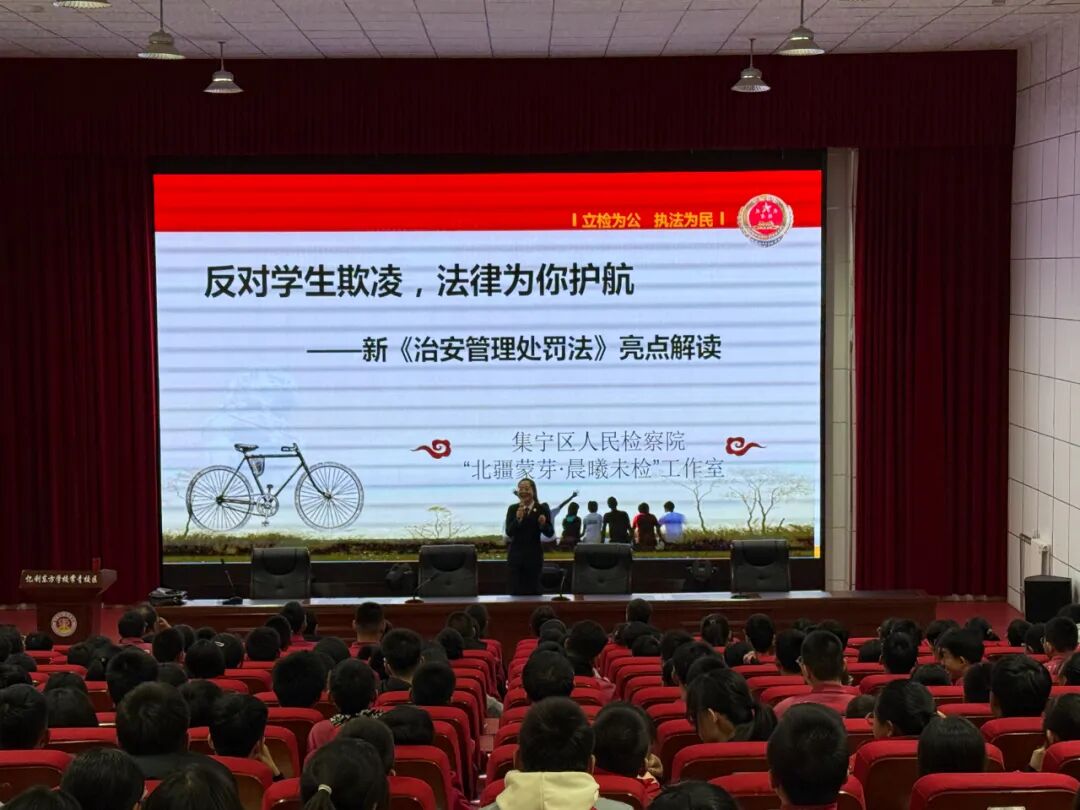 2025年12月11日,集宁区检察院晨曦未检工作室走进集宁区亿利东方学校常青校区,为300余名初二学生带来一堂以“反对校园欺凌,法律为你护航”为主题的法治教育课。课程结合将于2026年1月1日施行的新修订《中华人民共和国治安管理处罚法》,通过案例剖析、互动问答等形式,深入浅出地普及法律知识,引导学生增强自我保护意识,筑牢校园安全防线。