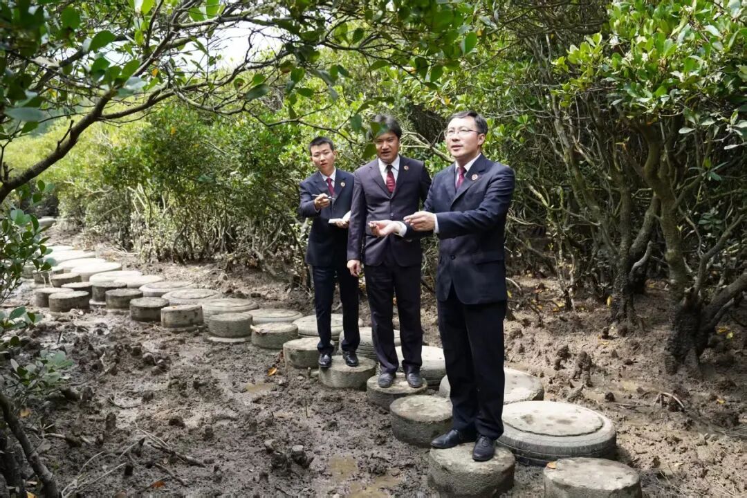 2025年3月31日,广东省廉江市检察干警在高桥红树林保护区实地查看红树林生长状况。