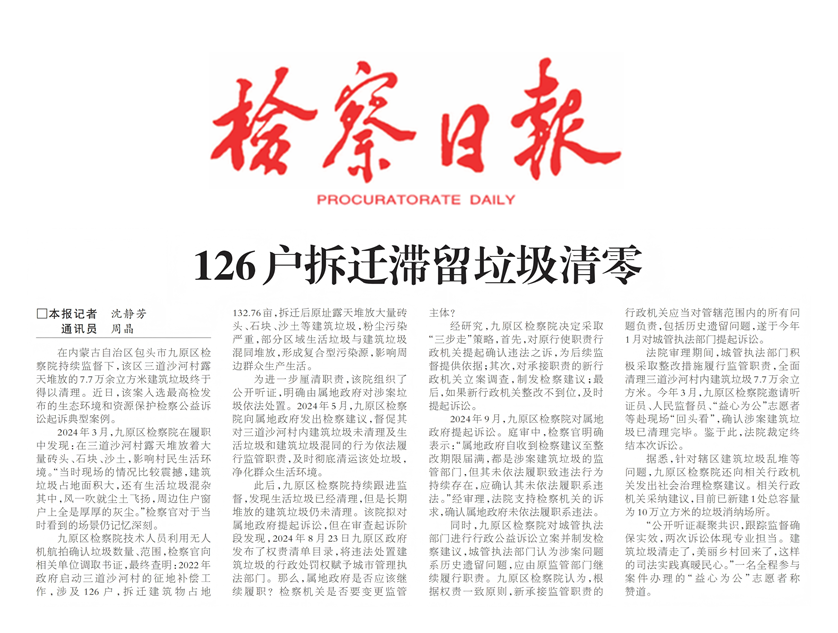 据悉,针对辖区建筑垃圾乱堆等问题,九原区检察院还向相关行政机关发出社会治理检察建议。相关行政机关采纳建议,目前已新建1处总容量为10万立方米的垃圾消纳场所。