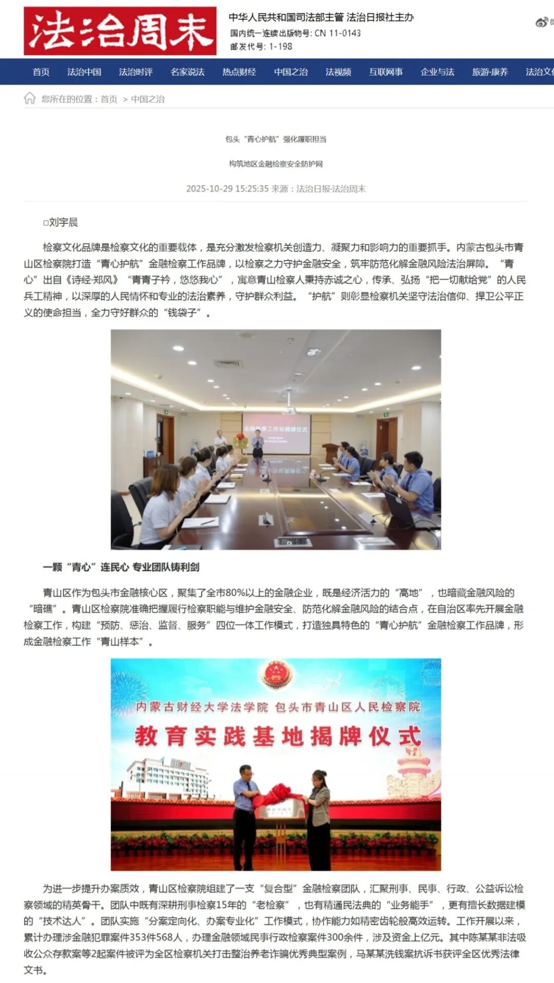 文章来源 |《法治周末》 2025年10月29日 法治日报·法治周末 报道检察文化品牌是检察文化的重要载体,是充分激发检察机关创造力、凝聚力和影响力的重要抓手。内蒙古包头市青山区检察院打造“青心护航”金融检察工作品牌,以检察之力守护金融安全,筑牢防范化解金融风险法治屏障。“青心”出自《诗经·郑风》“青青子衿,悠悠我心”,寓意青山检察人秉持赤诚之心,传承、弘扬“把一切献给党”的人民兵工精神,以深厚的人民情怀和专业的法治素养,守护群众利益。“护航”则彰显检察机关坚守法治信仰、捍卫公平正义的使命担当,全力守好群众的“钱袋子”。