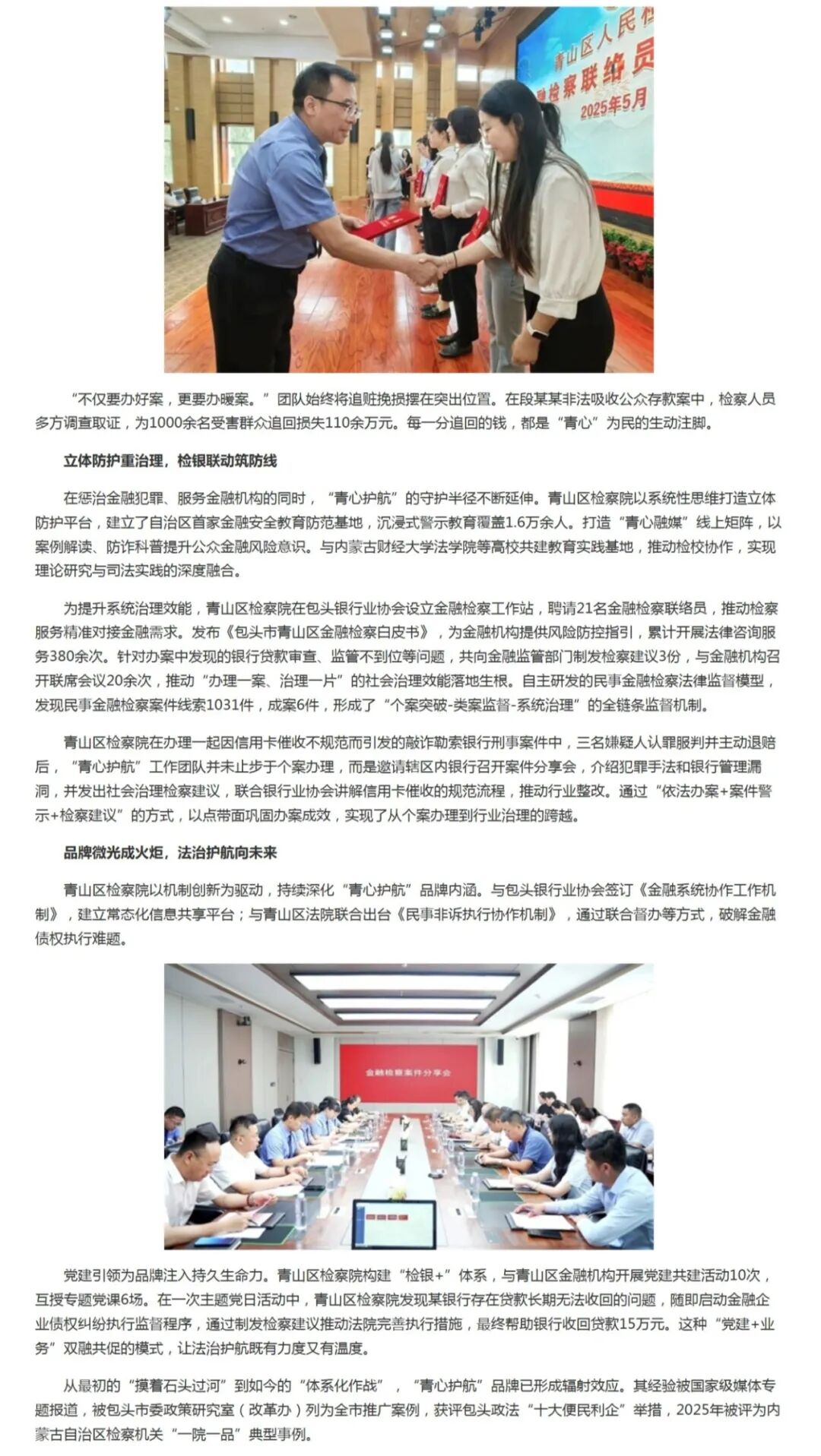 从最初的“摸着石头过河”到如今的“体系化作战”,“青心护航”品牌已形成辐射效应。其经验被国家级媒体专题报道,被包头市委政策研究室(改革办)列为全市推广案例,获评包头政法“十大便民利企”举措,2025年被评为内蒙古自治区检察机关“一院一品”典型事例。
