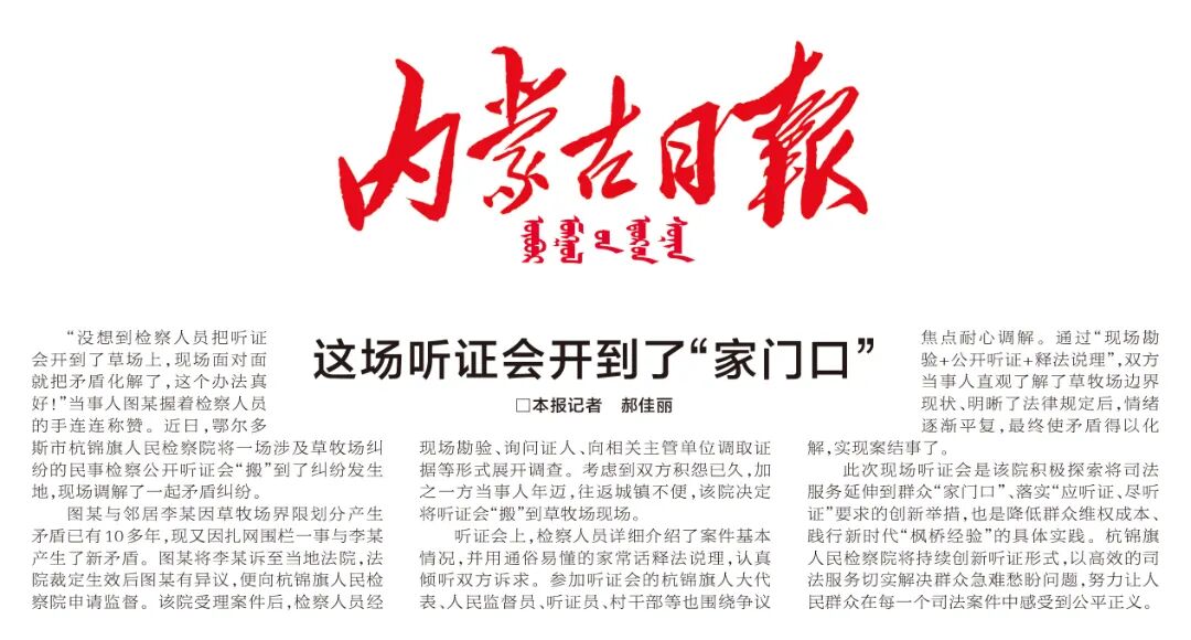 此次现场听证会是该院积极探索将司法服务延伸到群众“家门口”、落实“应听证、尽听证”要求的创新举措,也是降低群众维权成本、践行新时代“枫桥经验”的具体实践。杭锦旗检察院将持续创新听证形式,以高效的司法服务切实解决群众急难愁盼问题,努力让人民群众在每一个司法案件中感受到公平正义。