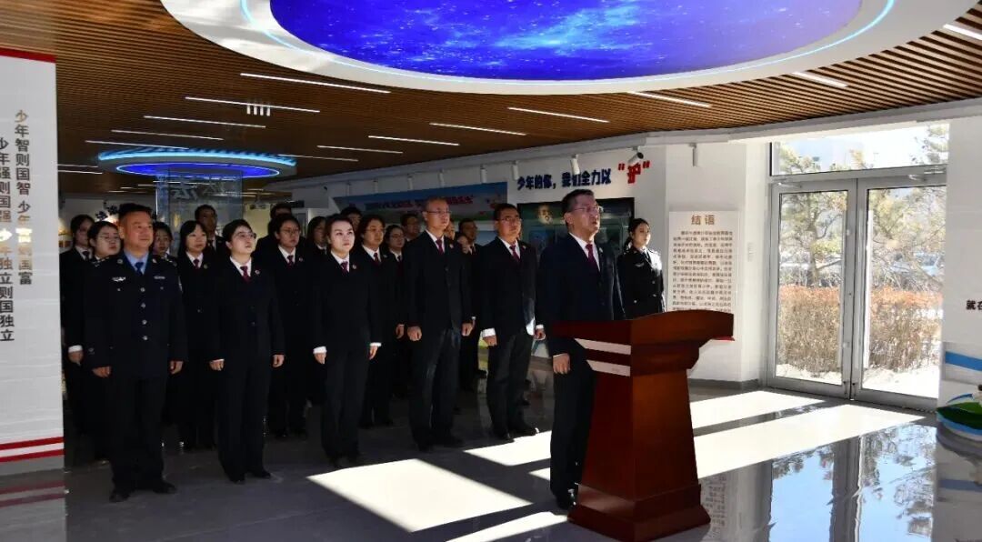 二是以仪式强化法治担当。举行庄严的国歌传唱与宪法宣誓仪式。全体检察人员身着检察制服,精神抖擞、列队肃立,伴随着雄壮激昂的《义勇军进行曲》,面向国旗肃立注目、齐声高唱。随后,领誓人左手抚按《中华人民共和国宪法》,右手举拳领诵誓词,全体宣誓人高举右拳庄严跟诵,铮铮誓言回荡现场,既是对宪法的郑重承诺,也是对检察职责的坚定坚守。