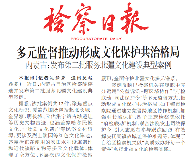 据悉,该批案例共12件,聚焦重点文化标识,覆盖范围既包括赵北长城、金界壕、明长城、元代集宁路古城遗址等历史文物古迹,也涵盖察哈尔民族文化、非物质文化遗产等民俗文化资源,更涉及烈士陵园等红色文化阵地,还囊括正在使用的农田水利设施遗址和近代铁路文物等多元文化载体,体现了全方位、多层次的文化保护检察履职,全面守护北疆文化多元谱系。