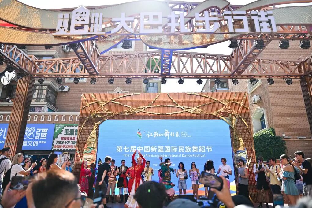 ▲2025年7月22日,在乌鲁木齐新疆国际大巴扎,意大利米兰芭蕾舞团的演员与新疆民族舞蹈演员共舞。新华社记者 辛悦卫 摄