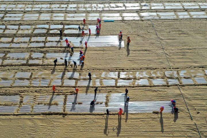 ▲在新疆和田地区于田县沙产业实验基地,当地群众在种植薏米(2025年4月8日摄,无人机照片)。新华社记者 丁磊 摄