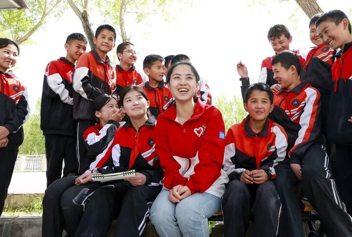 ▲在新疆阿图什市哈拉峻乡谢依特小学,支教教师高淑贤和学生们在一起(2025年4月23日摄)。新华社记者 王菲 摄