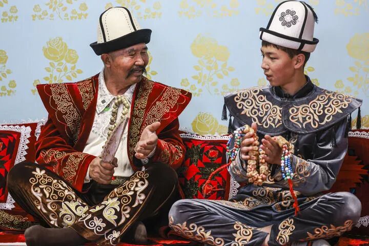 ▲《玛纳斯》国家级非物质文化遗产代表性传承人江努日·图日干巴依(左)教徒弟演唱《玛纳斯》(2025年4月21日摄)。新华社记者 王菲 摄