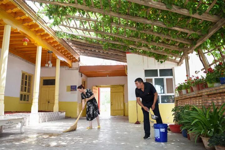 ▲在新疆喀什地区疏附县阿亚格曼干村,村民阿卜都克尤木·肉孜(右)和妻子在打扫庭院(2022年6月10日摄)。新华社记者 丁磊 摄