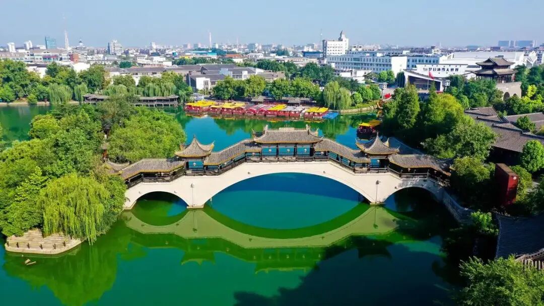 ▲这是2023年8月10日拍摄的位于枣庄市台儿庄区的大运河国家文化公园(枣庄段)台儿庄古城景色(无人机照片)。新华社记者 郭绪雷 摄