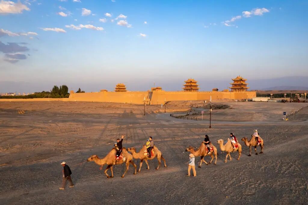 ▲2024年7月15日,游客在嘉峪关关城旁骑骆驼游览(无人机照片)。新华社记者 郎兵兵 摄