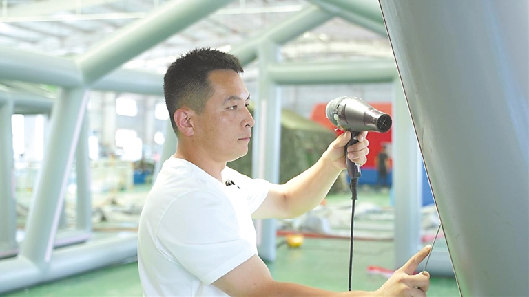 走进位于承德市丰宁满族自治县的怀丰产业园,河北亚图帐篷有限公司的生产车间里,轰隆隆的机器声交织成忙碌的“乐章”。工人们个个全神贯注,手头作业不停。班组长秦伟正熟练地组装帐篷的零部件。