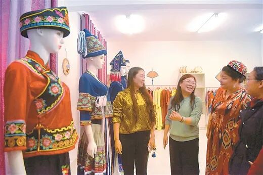 ▲广西南宁市兴宁区望仙坡社区党建中心引进隆林各族自治县的非遗工坊,打造服饰展示区,增进各民族居民相互了解、相互欣赏、相互学习,建设各民族共享共乐的中华民族共有精神家园。广西日报记者 覃文武 摄
