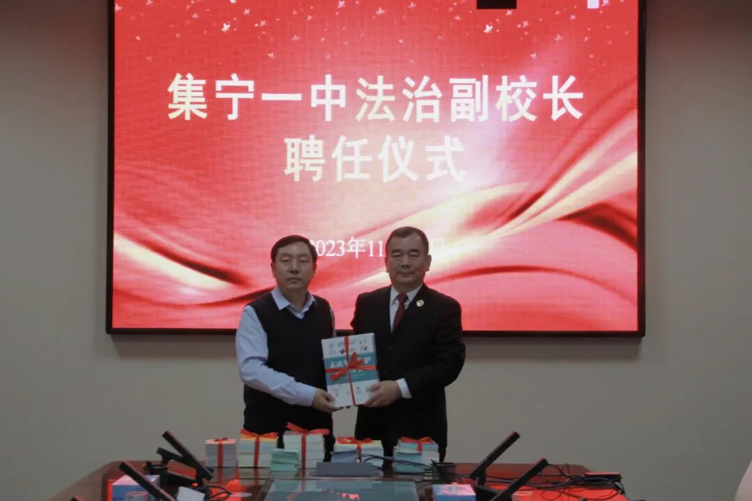 聘任仪式上,兰荣彦校长代表集宁一中为党组书记郭文秀颁发聘书,聘任其为集宁一中法治副校长,郭文秀代表乌兰察布市人民检察院向集宁一中赠送未成年人法治教育相关图书,兰荣彦校长代表集宁一中接收书籍。