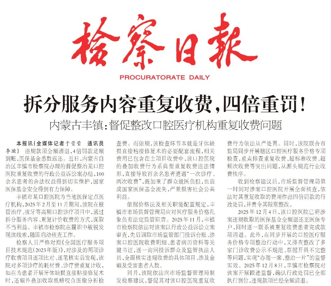违规款项全额清退,4倍罚款足额到账,医保基金悉数返还。近日,内蒙古自治区丰镇市检察院办理的督促整治某口腔医院重复收费的行政公益诉讼案办结,100余名患者的合法权益得到切实维护,国家医保基金安全得到有力保障。