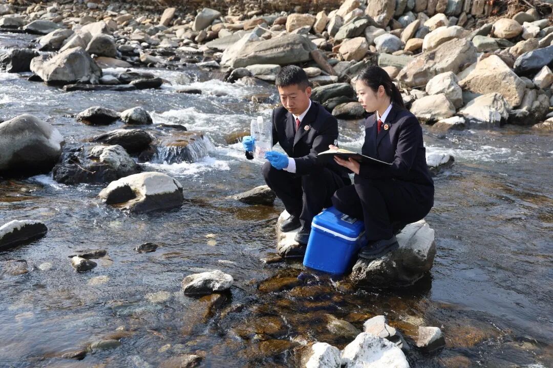 收到陕西省生态环境检察指挥中心平台推送的生活污水直排平利县某镇河道线索后,平利县检察院检察官携带便捷检测设备,前往某镇河道采集水样。